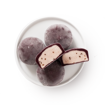 Mochi Dough: (sugar, rice flour, water, cocoa (processed with alkali), purple carrot juice, salt, calcium sulfite, enzymes)